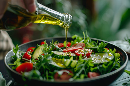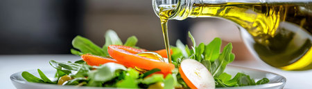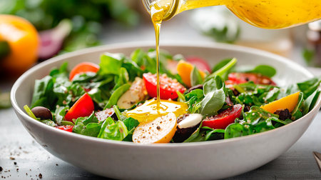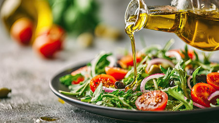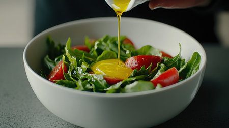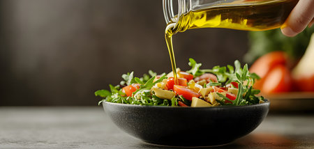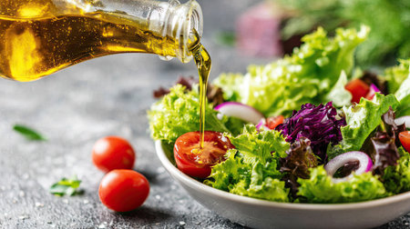 olive oil drizzling onto a fresh salad, created with generative ai