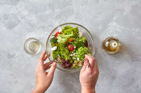 Dietary dishes, salad. Female hands holding a glass bowl with a delicious salad, hands of another woman pouring olive oil, positive.