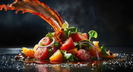 A vibrant, artfully arranged salad with fresh vegetables and a rich sauce being poured over it, set against a dark background.