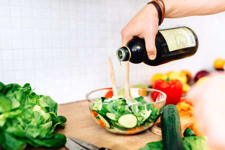 Professional chef pours oil into a salad bowl in the kitchen. Cooking delicious and healthy food with a set of vitamins.