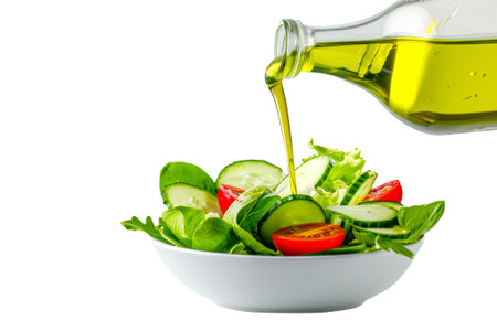pouring olive oil in to healthy salad isolated on white background