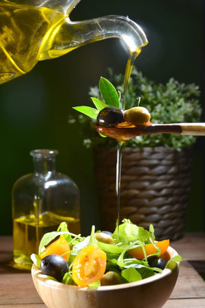A close-up image of a hand pouring olive oil from a glass bottle onto a fresh salad. The salad contains lettuce, cucumber slices, cherry tomatoes, and olives. The scene is set on a wooden table with a blurred background, emphasizing the freshness and healthiness of the meal.