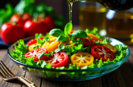 A close-up of a fresh salad featuring vibrant greens, juicy tomatoes, and olive oil being poured over it. The background is softly blurred, enhancing the dish's appeal and freshness.