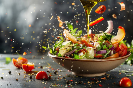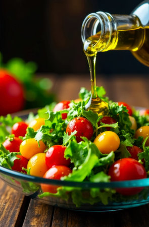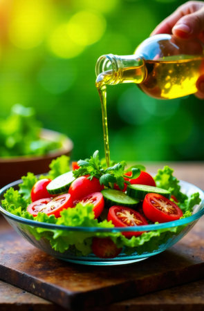 A vibrant and fresh vegetable salad being drizzled with olive oil, perfect for healthy eating. Captured on a rustic table, this dish showcases wholesome ingredients.