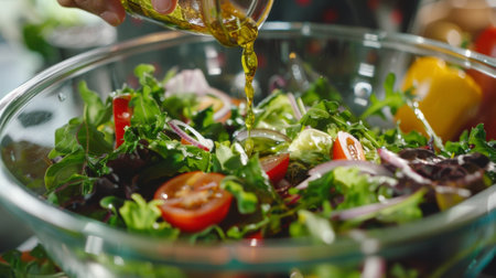 A close-up view displays a bowl of fresh salad being drizzled with oil. The scene showcases vibrant greens, red tomatoes, and purple onions. The composition is well-lit, highlighting the colors and textures. This image suits various commercial uses, including food blogs, advertising, and editorial content related to healthy eating.