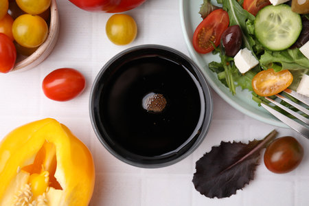 Vinegar in glass, salad and products on white tiled table, flat lay