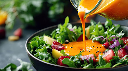 A vibrant orange dressing being poured from a jug onto a bowl of fresh greens and fruit