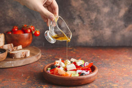 Woman dressing fresh Greek salad on table