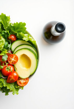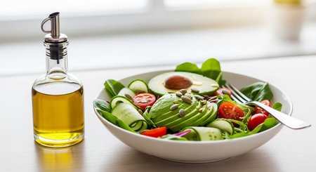A close-up of fresh vegetables in a bowl, featuring olive oil being drizzled over a vibrant salad, showcasing the beauty of healthy ingredients in a modern kitchen environment.
