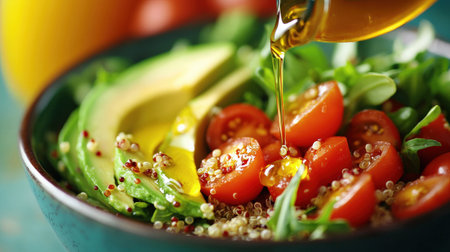 A close-up of a colorful salad bowl with quinoa, avocado slices, cherry tomatoes, and a drizzle of olive oil