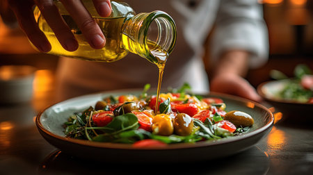 A skilled chef drizzles olive oil over a colorful salad featuring cherry tomatoes, greens, and herbs. The kitchen is well-lit, enhancing the dish's freshness.