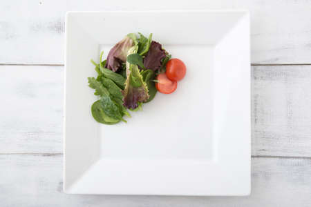 A vibrant mixed salad featuring greens and radishes, beautifully arranged on a white plate. Perfect for showcasing healthy eating and culinary presentation.