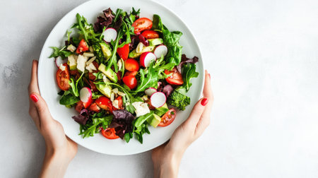 Closeup of woman holding a plate of fresh mixed vegetable salad.