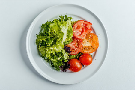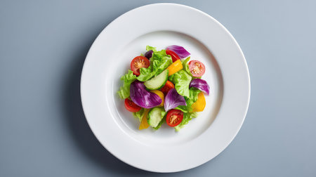 A beautifully arranged salad featuring a mix of fresh vegetables on a white plate, perfect for showcasing healthy eating and vibrant culinary creativity.