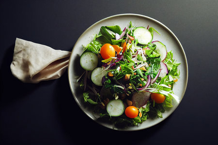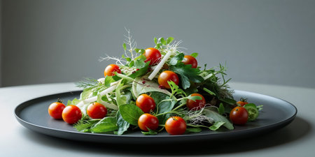 AI Generated. Fresh Salad with Colorful Cherry Tomatoes and Thinly Sliced Vegetables on Dark Plate