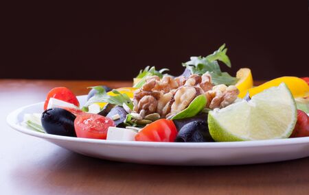 Closeup on a fresh healthy green salad with olive, cheese and walnuts in a white plate