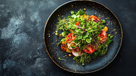 Colorful salad topped with fresh microgreens served on a black plate. Gourmet dish blending vibrant flavors and healthy eating.