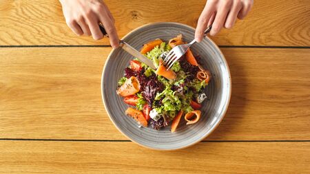 Lunch Time. Guy sitting at table eating salmon salad top view close-up
