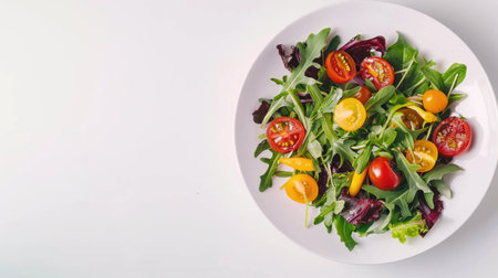 Salad with fresh summer vegetables on white background. Top view with copy space. AI Generated