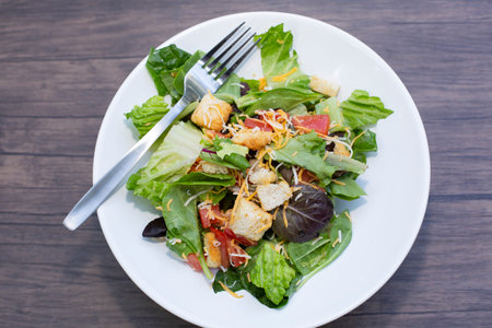 Salad of romaine lettuce, croutons, shredded cheddar cheese, and tomato on a white plate on a wooden table