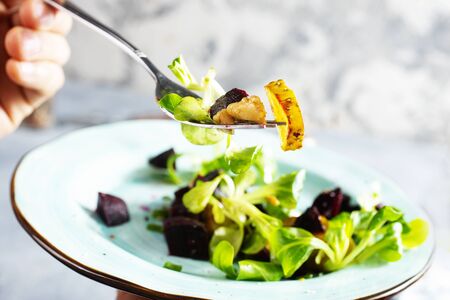 Eating tuna and lettuce Nicoise salad at the restaurant, haute cuisine