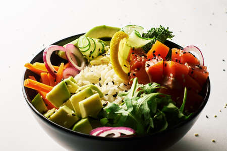 poke bowl with salmon islated on white background. side view