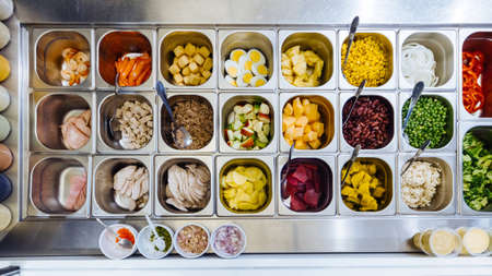 Top view of salad bar with assortment of ingredients for healthy and diet meal.