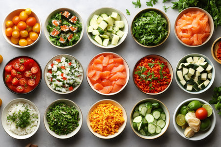 Colorful bowl set: fresh ingredients in portions