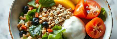 Fresh salad bowl with colorful ingredients featuring greens, fruits, and yogurt in a rustic setting