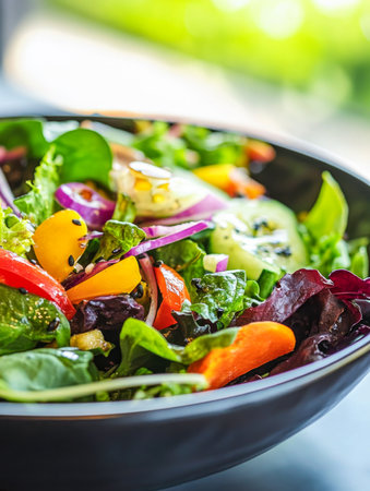 Colorful salad bowl featuring fresh greens and vibrant vegetables served at a healthy eatery