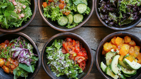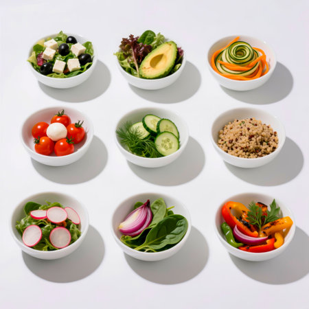 A vibrant arrangement of fresh salad ingredients displayed in bowls showcases the beauty and variety of healthy foods for delicious meal prep and salad recipes.