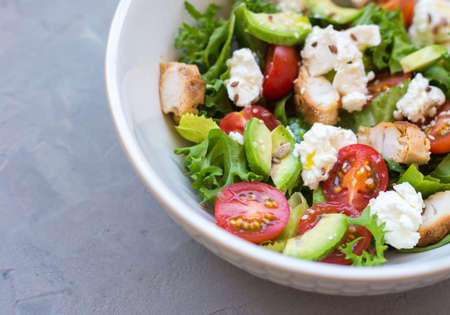 Fresh salad made of tomato, ruccola, chicken breast and avocado. Caesar salad in a white bowl on gray background