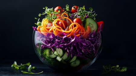 A colorful salad with red cabbage, carrots, cucumber, and tomatoes in a glass bowl