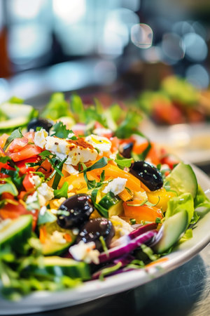 A vibrant salad on a plate features tomatoes, cucumbers, olives, red onions, peppers, fresh herbs and cheese. The fresh produce creates a colorful and appealing dish. The salad is presented on a reflective table.
