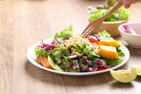Fresh organic vegetables with quinoa salad on wooden background ready to eating, Healthy Vegan food
