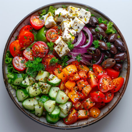 Photo of a greek salad plate with white background