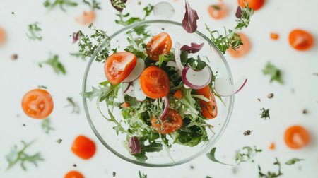 A dynamic view of fresh salad ingredients in motion, featuring cherry tomatoes, greens, and herbs, evoking a sense of freshness and healthy eating for vibrant meals.