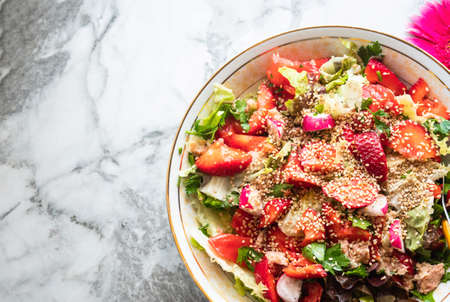 Fresh summer healthy fiber protein vitamin salad in bowl with strawberries, lettuce, tuna, tomatoes