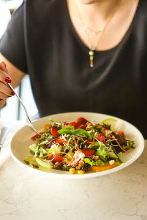 Woman eating green salad on plate by hand. Ruccola and cabbage with grated cheese, healthy nature food, dieting menu, close up picture