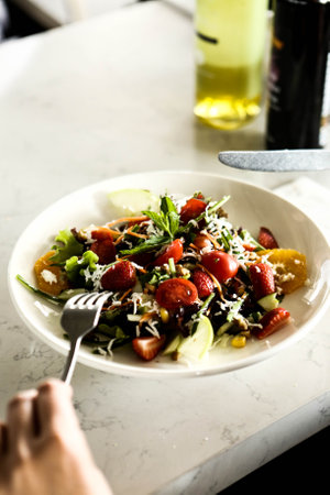Colorful fresh salad with a mix of vegetables and fruits at a cozy dining setting in a restaurant