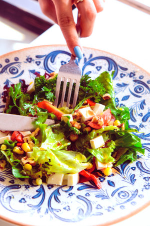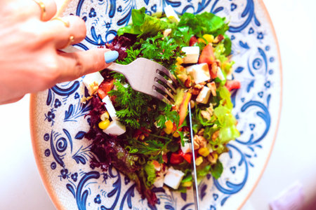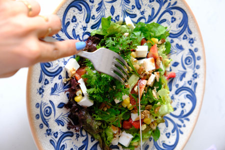 a close-up of a vibrant mixed salad with fork, created with generative ai