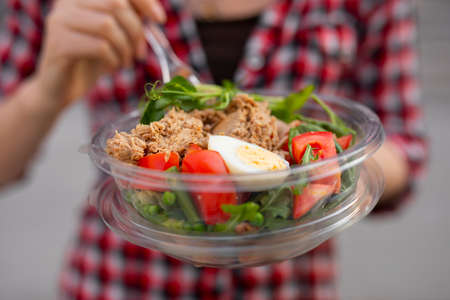 Eating salad at urban city outdoor, fast dinner snack
