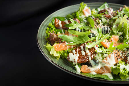 salad with salmon, dried tomatoes and green rucola on a black background