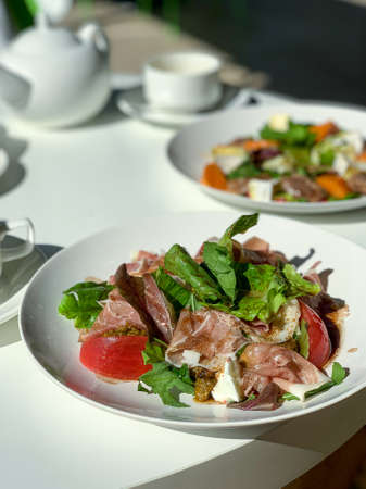 Salad with Parma ham, tomatoes, yellow beetroot, and vinaigrette sauce. Appetizing dish served on a white plate. culinary photography.