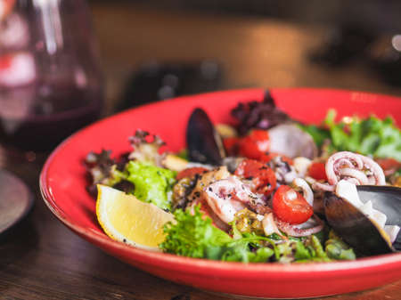 Fresh mediterranean seafood salad with olive oil, lemon, tomatoes and lettuce in red plate on the table in restaurant