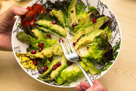 eating bowl of guacamole, lettuce and pomegranate. healthy and dietary food