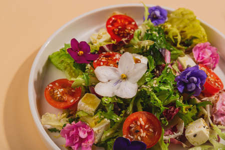 Beautiful healthy spring salad decorated with flowers