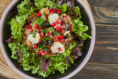 Eggplant salad with feta cheese, pomegranate and currants in a coffee marinade. French gourmet cuisine. Close up