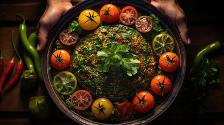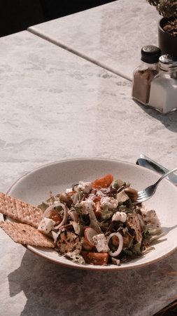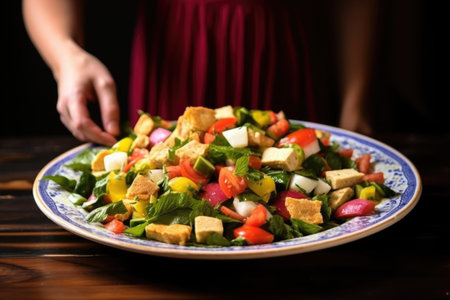 hand serving a plate of fattoush salad, created with generative ai