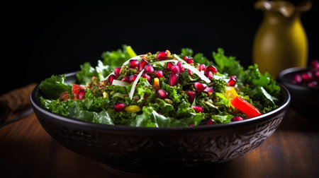 Tabbouleh salad with pomegranate seeds on wooden background